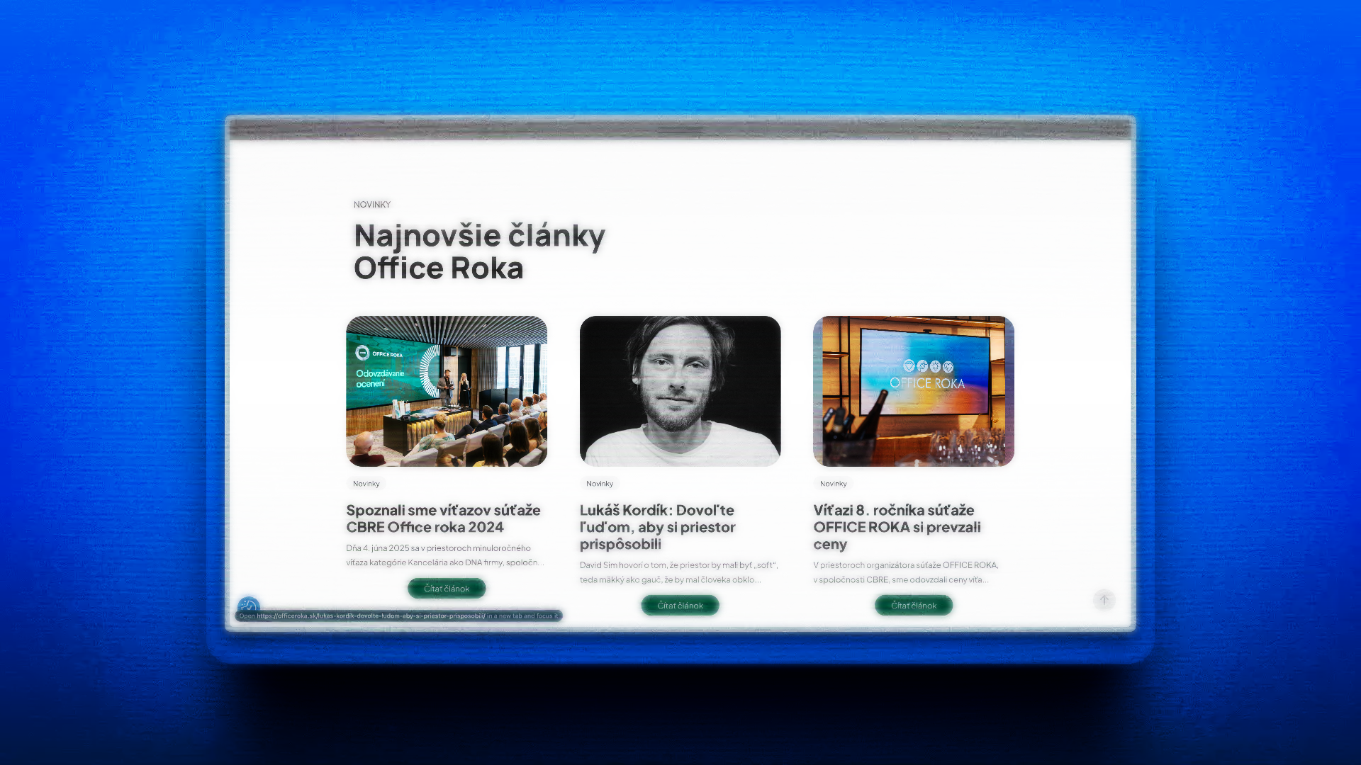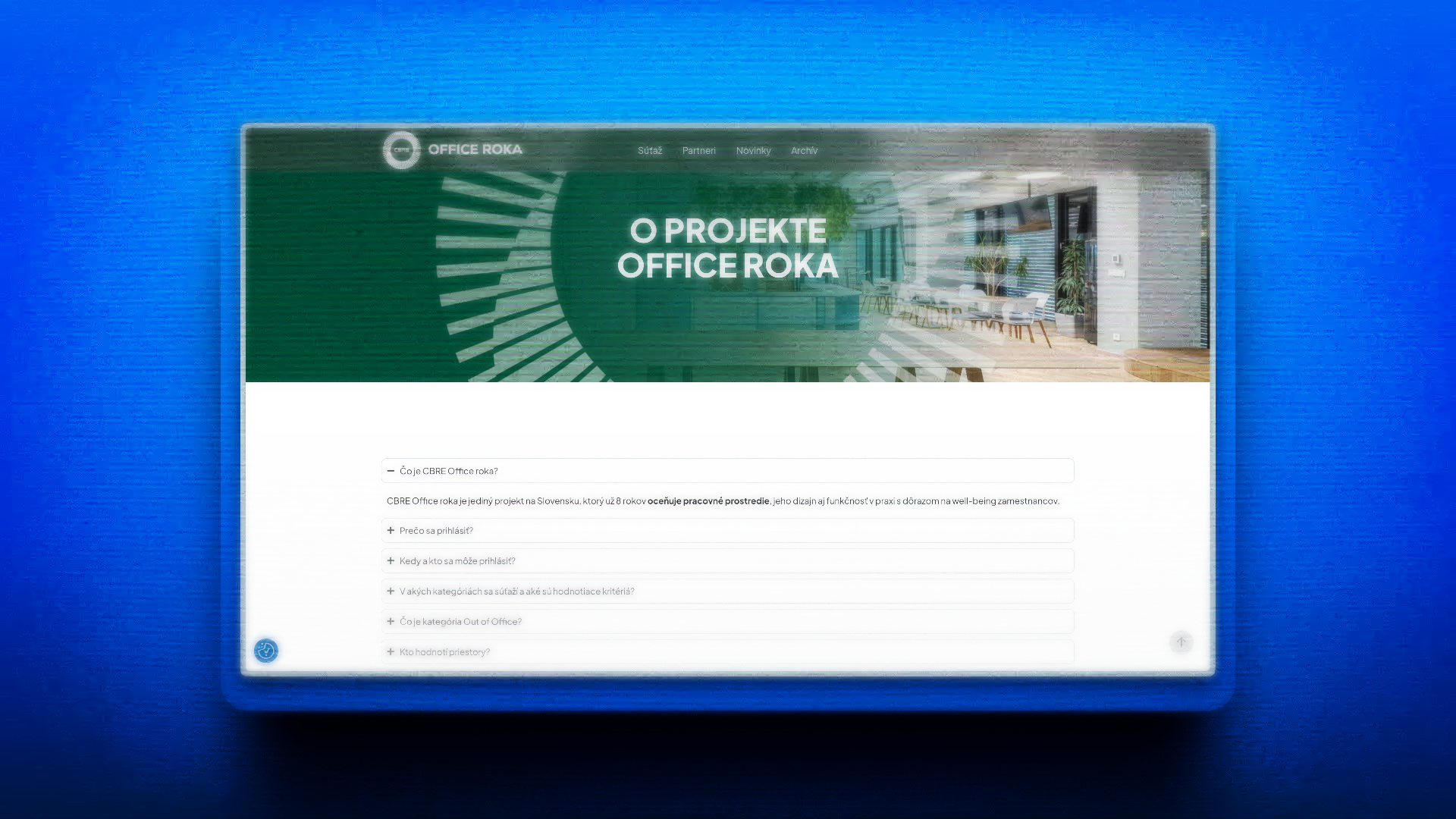 Inovatívny webový projekt pre CBRE Office Roka, ktorý predstavuje moderný prístup k prezentácii kancelárskych priestorov. Projekt kombinuje kreatívny dizajn s funkčnosťou a poskytuje používateľom intuitívne rozhranie.